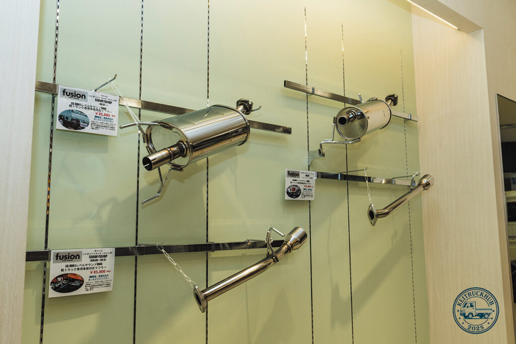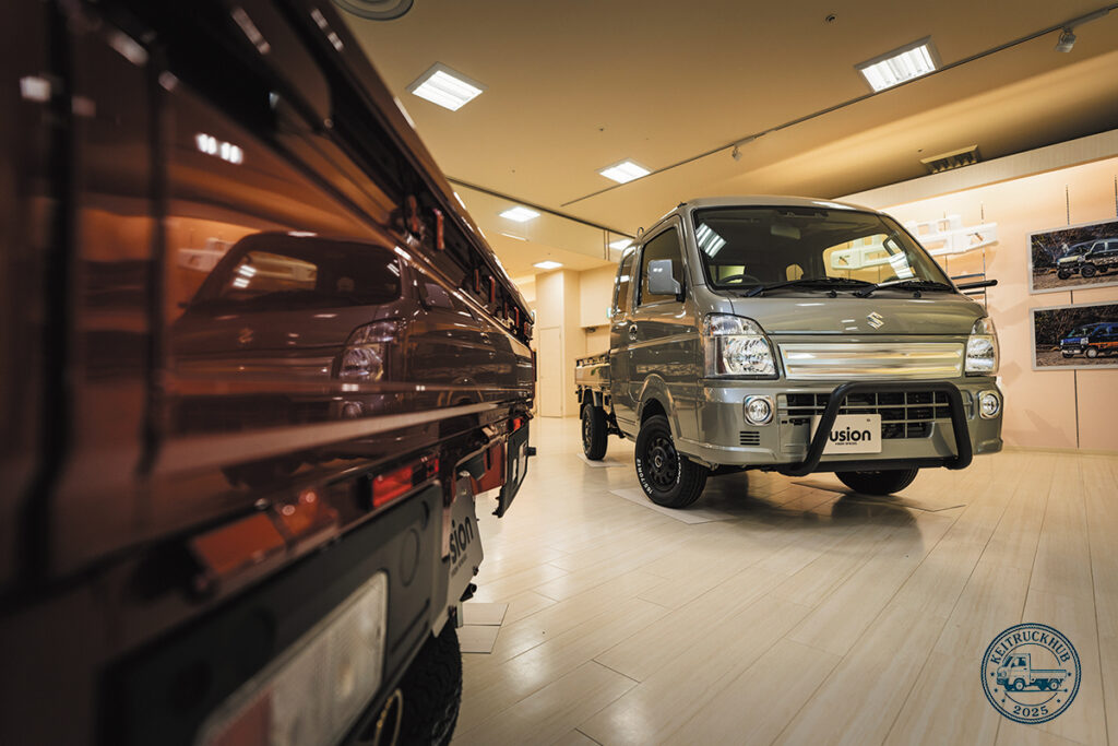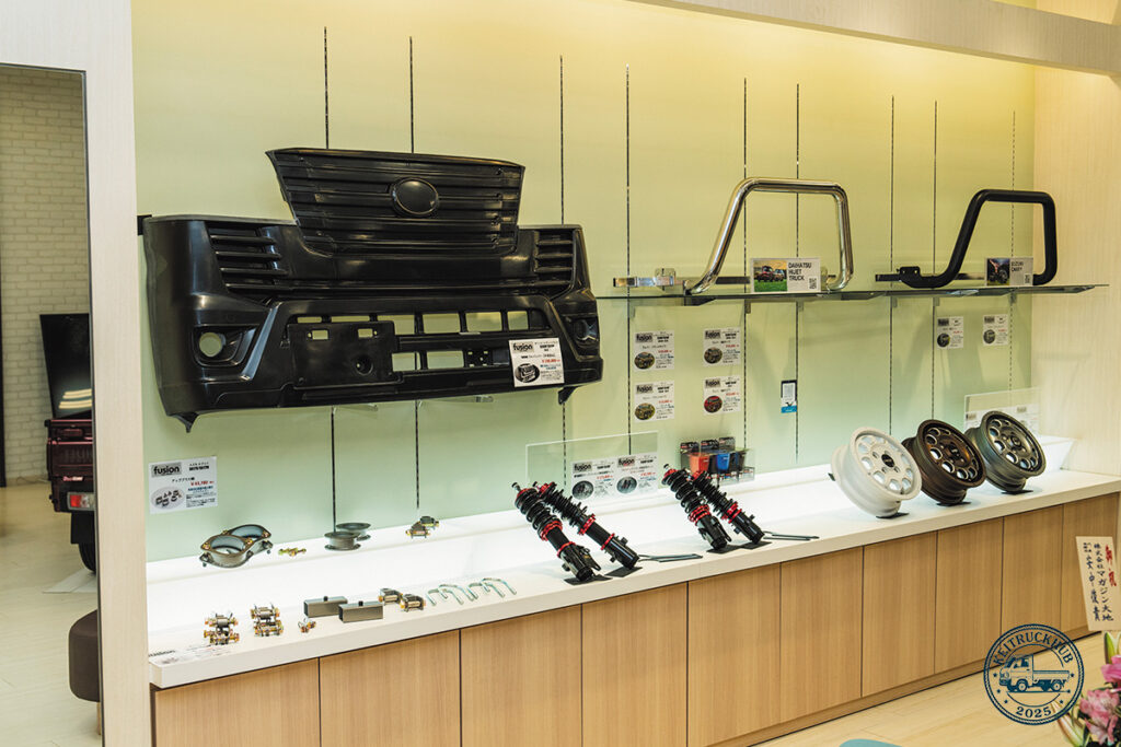 fusion FROM SPIEGEL operates a showroom on the first floor of AEON Mall Futtsu in Futtsu City, Chiba Prefecture. The showroom displays and sells complete custom builds including not just mini trucks, but also Jimnys, Sierras, Everys, and more. The fusion parts brand uses this location as a launch point for original, high-design, premium-quality components.